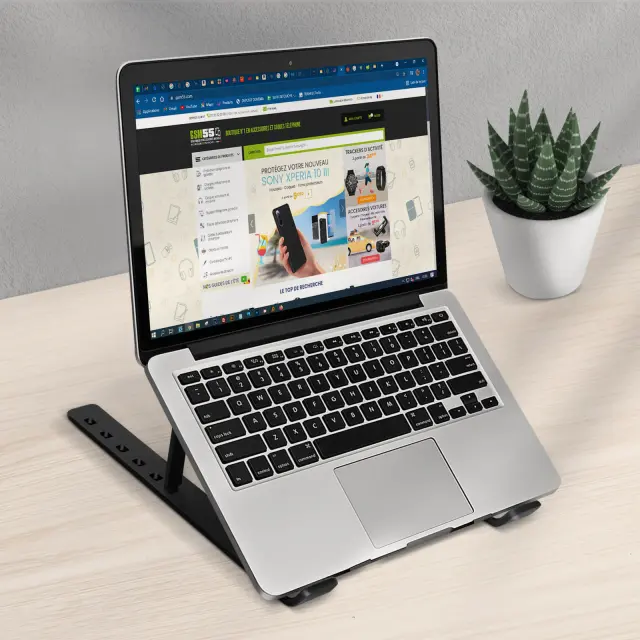 Namizno stojalo za prenosni racunalnik, da postavite svoj prenosni racunalnik v optimalen kot gledanja. Ima protizdrsne blazinice za zašcito naprave pred praskami. Njena višina je nastavljiva na 7 kotov naklona. Zložljivo namizno stojalo.