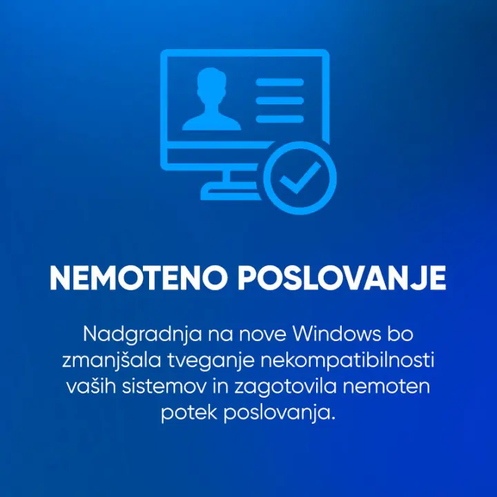Čeprav bodo računalniki v vašem podjetju še vedno delovali, bo uporaba zastarelega operacijskega sistema predstavljala povečano varnostno tveganje in nekatere omejitve pri produktivnosti, saj sistemi ne bodo več posodobljeni.