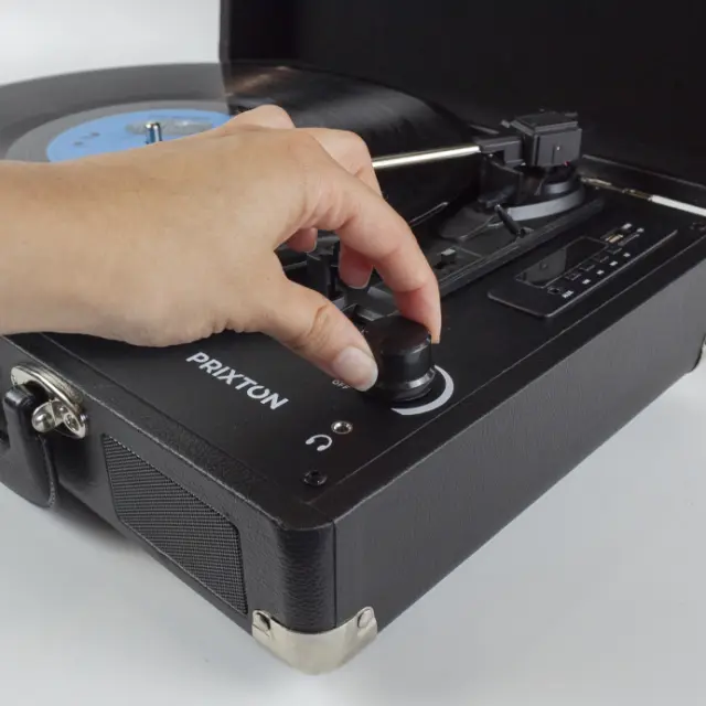 • Adapter. Vkljucuje adapter za 45 rpm za predvajanje vinilov razlicnih velikosti. Ima tudi 3 hitrosti predvajanja: 33, 45 in 78 rpm.
