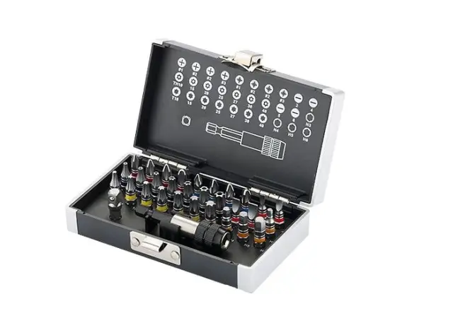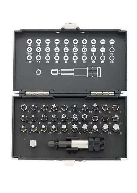 Set vsebuje 30 bitov iz kakovostnega orodnega jekla S2, z režami PH1, PH2, PH3, PZ1, PZ2, PZ3, T10, T15, T20, T25, T27, T30, T40, H3, H4, H5, H6, SL3 , SL4, SL5, SL6, TH10, TH15, TH20, TH25, TH27, TH30 in TH40, ki so najbolj iskani v različnih dejavnostih.