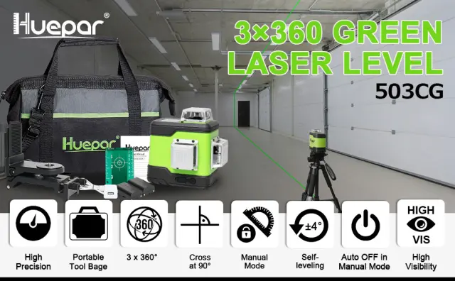 VISOKA NATOČNOST & 3 x 360 LINE LASERS: Lasersko orodje Huepar uporablja ultra svetel zeleni žarek z ± 1/13 palca pri 33 Ft visoko natančnosti. Ena 360° vodoravna in dve 360° navpični laserski liniji omogočata uporabnikom, da prekrijejo tla, stene, strop po vsem prostoru. Dve navpični črti se križata pod kotom 90° omogoča uporabniku hitro vizualizacijo in dokončanje kvadratne postavitve. Ta 360-stopinjski laserski nivo je odlično orodje za različne aplikacije niveliranja in postavitve.