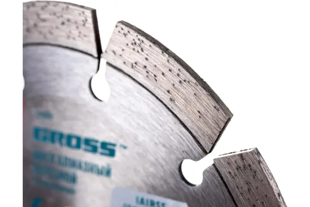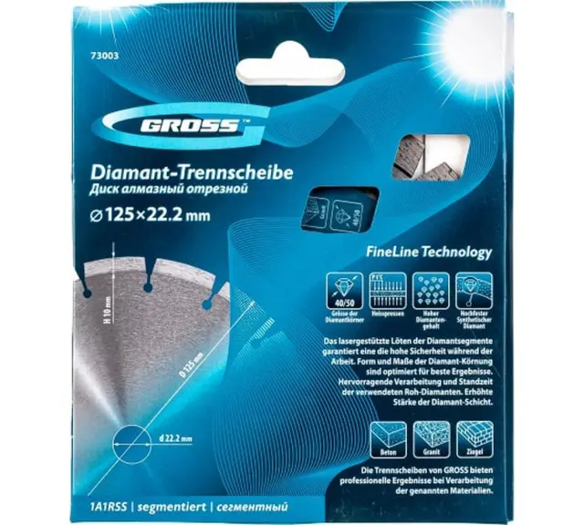 Diamantno rezilo blagovne znamke GROSS 125 x 22,2 mm je namenjeno za suho rezanje (brez hladilne tekočine) trdnih materialov: betona, marmorja, železnih blokov in granita. 10 mm visok rezalni segment diska je lasersko privarjen na disk za najboljše prileganje. Rezalni segment vsebuje veliko količino sintetičnih diamantov s premerom 40-50 mikronov, ki zagotavljajo učinkovitost opravljenega dela in povečujejo odpornost proti obrabi diska.