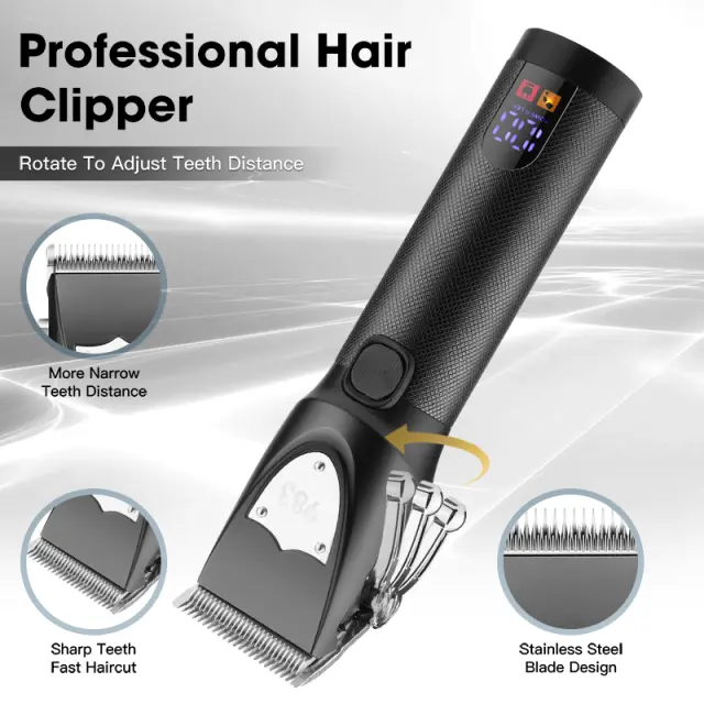Dolga življenjska doba baterije: Ta komplet strižnikov, ki ga poganja dolgotrajna litij-ionska baterija, zagotavlja podaljšan čas delovanja brez kabla. Uživajte v do 120 minutah neprekinjene uporabe z enim polnjenjem, kar je kot nalašč za večkratno striženje brez prekinitev. LED zaslon priročno prikazuje preostalo življenjsko dobo baterije, kar zagotavlja, da imate vedno nadzor.