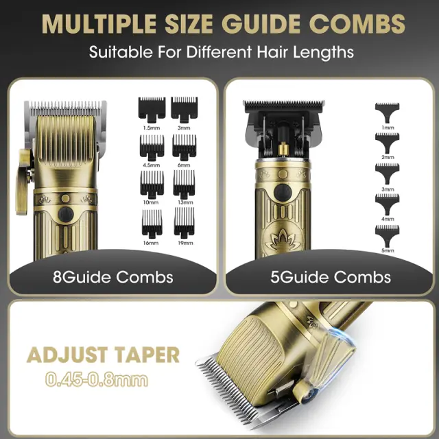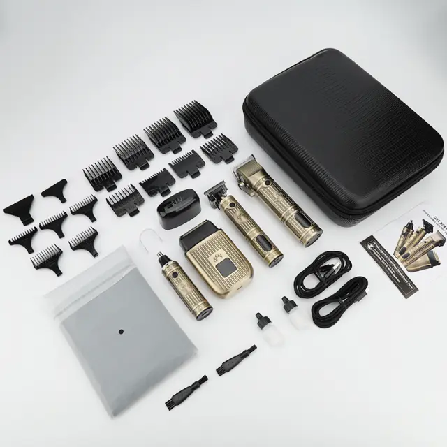 Popoln komplet dodatne opreme: Komplet vsebuje široko paleto dodatkov za izboljšanje vaše izkušnje nege. Vključuje več vodilnih glavnikov za strižnik za lase (1,5, 3, 4,5, 6, 10, 13, 16, 19 mm) in natančen trimer (1, 2, 3, 4, 5 mm), ki omogočajo različne dolžine in stile las. Vključeni so tudi dva USB polnilna kabla, dvomrežna glava brivnika, glava trimerja za nosne dlačice, dve čistilni ščetki, frizerska ogrinjala, torba za shranjevanje EVA in dve steklenički olja za vzdrževanje rezil. Ta celovit komplet zagotavlja, da imate vse, kar potrebujete za profesionalno nego.