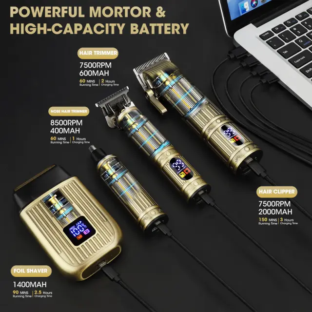 Dolga življenjska doba baterije: Vsaka naprava v tem kompletu ima močno baterijo, ki zagotavlja dovolj časa delovanja za več negovalnih sej. Velik strižnik za lase se ponaša z baterijo 2000 mAh, ki ponuja 150 minut uporabe, natančen trimer ima baterijo 1400 mAh za 60 minut, brivnik zagotavlja 90 minut s svojo baterijo 600 mAh, trimer za nosne dlačice pa ponuja 60 minut s svojo baterijo 400 mAh. Hiter čas polnjenja zagotavlja, da so naprave vedno pripravljene, ko jih potrebujete, s polnim polnjenjem v samo nekaj urah.