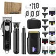 Vsestranski in popoln: Ta 4-v-1 komplet vključuje strižnik polne velikosti, prirezovalnik, brivnik in prirezovalnik dlak v nosu, ki zadovolji vse vaše potrebe po negi. Različni nastavki in glavniki zagotavljajo vsestranskost za različne pričeske in dolžine.