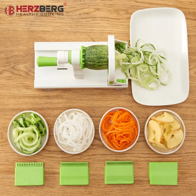Spiralni rezalnik je neverjetna naprava, uporabna v kuhinji za okrasitev jedi ali pripravo povsem novih. Zahvaljujoč njej bodo vaše jedi dobile značaj in bodo lepo predstavljene na krožniku. Popolna naprava za zelenjavo in sadje, kot so korenje, zelje, kumare, krompir, redkev, bučke, jabolka in drugo.