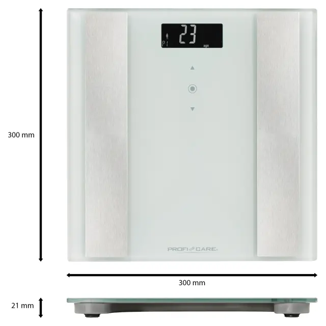 Elektronska steklena osebna tehtnica Profi Care PC-PW3007FA omogoča natančno merjenje telesne teže ter celovito analizo telesne sestave, vključno z maščobo, vodo, mišično in kostno maso, visceralno maščobo, ITM ter dnevnimi energijskimi potrebami (MBR). Opremljena je z jasno berljivim LCD-zaslonom, samodejnim vklopom ob stopanju in veliko površino iz varnostnega stekla z nedrsečimi nogicami. Primerna je za vsakodnevno domačo uporabo.