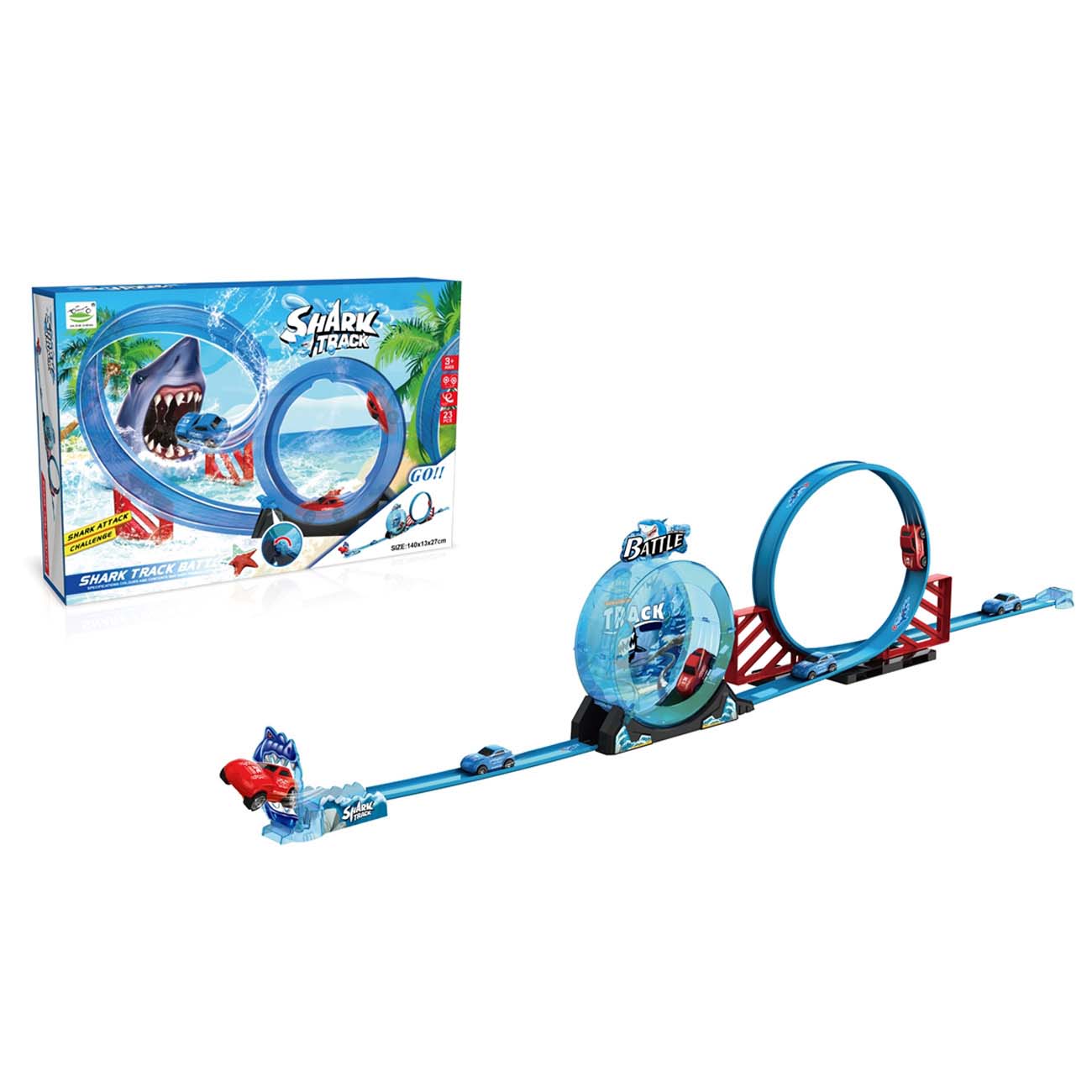 Edinstven komplet z dirkalno stezo, opremljeno z avtomobilom za vlecenje, dvema linearnima stezama in 360° krožno stezo ter drugimi dodatki. Pazite se lacnih morskih psov, ki poskušajo pojesti vaš avto, spodbudite svojo domišljijo in poišcite nacin za zmago v igri. Odlicen igralni set. Steza za avtomobile za neverjetne podvige. Odlicen set za vznemirljivo, domiselno in dolgotrajno otroško igro.