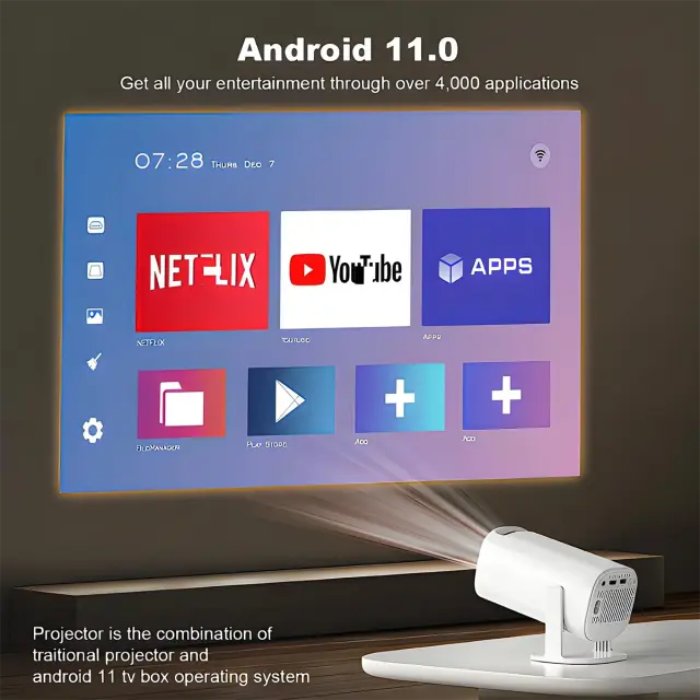Priročno in tiho delovanje: Projektor, ki ga poganja Android TV 11.0, ima 1 GB + 8 GB pomnilnika in ... vgrajen 3W zvočnik. Z ravnijo hrupa le 25 dB zagotavlja tiho in udobno izkušnjo gledanja.