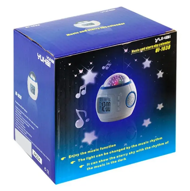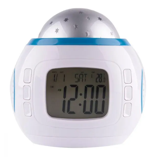 Ura z budilko, ki prikazuje pisano projekcijo zvezdnega neba v prostoru, ki se spreminja v ritmu predvajane melodije.