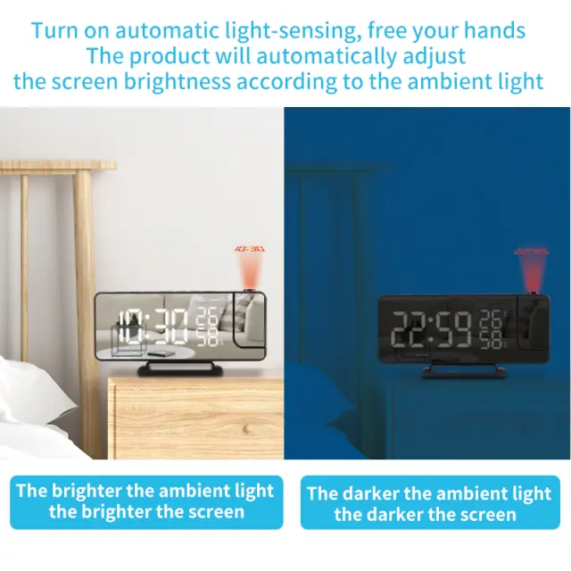 LED budilka: Ura projektorja ima funkcijo dremeža in je opremljena z LED zaslonom, katerega svetlost je mogoče nastaviti v 6 različnih stopnjah.