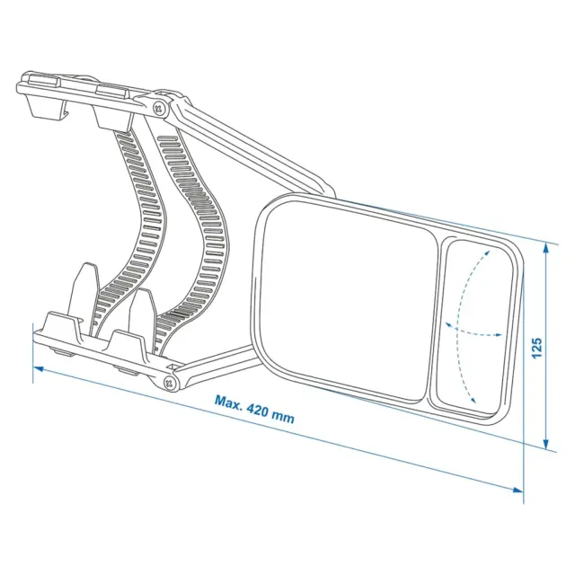 Univerzalno ogledalo za prikolice lahko preprosto namestite in odstranite s pomočjo elastike in nastavljivih trakov. Ogledalo ne bo oviralo obstoječega ogledala, uporablja pa se lahko na levi in desni strani. Dodatno ogledalo za mrtvi kot lahko nastavite posamezno.
