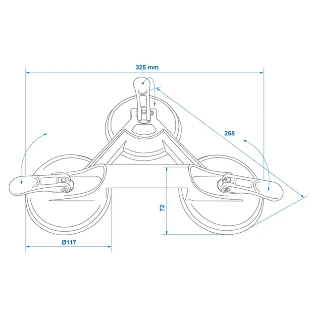 Ta vakuumska dvigalka s tremi priseski se ponaša z zelo priročno obliko. Vakuum se ustvari z obračanjem ročic. Vsak prisesek ima svoj lasten vzvod za hitro izpuščanje in zaklepanje.