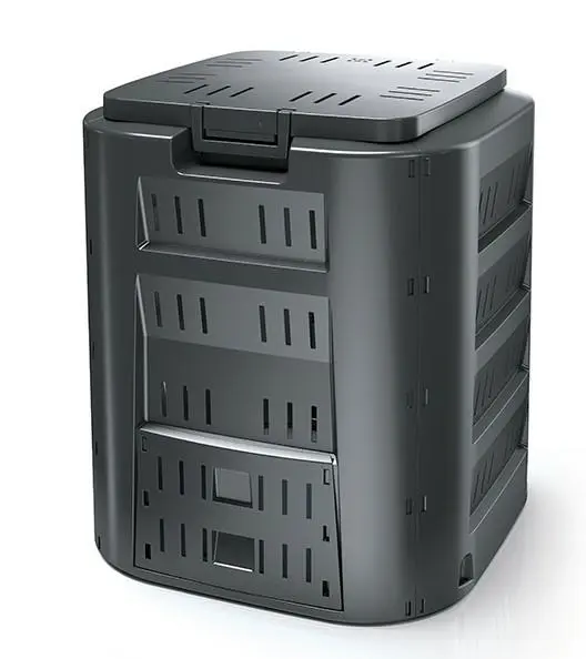 Komposter je opremljen z veliko luknjo za nalivanje organskih ostankov, ki je zaprta s pokrovom, opremljenim z ergonomskim ročajem, ki je tudi zaščita pred odpiranjem vetra ali živali. Dva ventila v spodnjem delu omogočata priročno odstranjevanje komposta. Nevtralne barve in preproste oblike pomenijo, da se komposter zlije s pokrajino vrta in ne moti domačega prostora.
