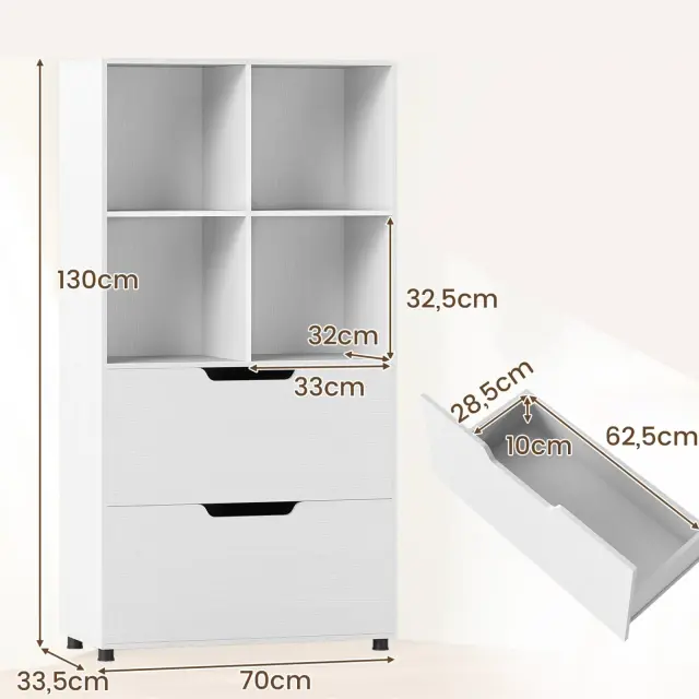 Sorazmerna postavitev: ta knjižna omara ima 4 odprte kocke in širok zgornji del, ki zagotavlja dovolj prostora za knjige, zbirateljske predmete ali okraske. Pod temi kockami sta 2 izvlečna predala, ki zagotavljata skriti prostor za shranjevanje, da bo vaš bivalni prostor urejen.