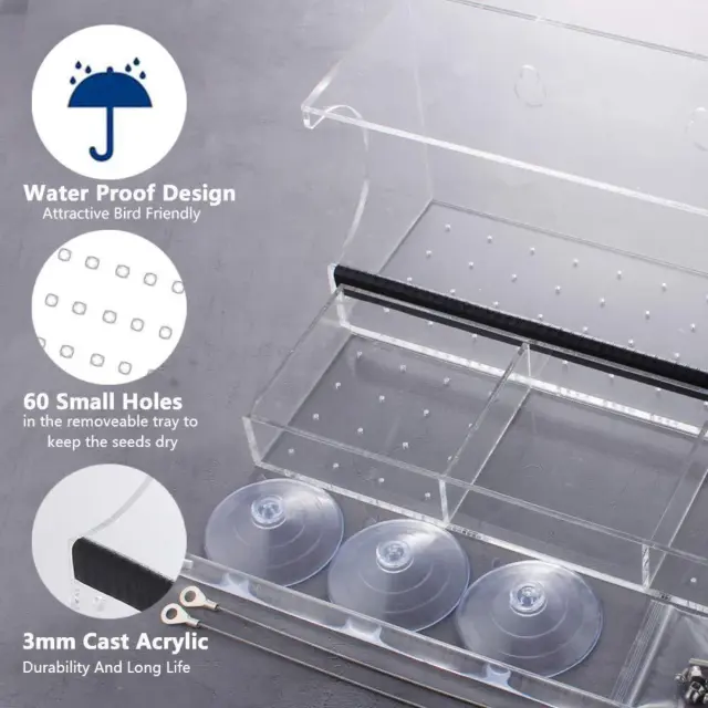 Crystal Clear Viewing: Prosimo, upoštevajte: to niso originalni deli. Uživajte v neprimerljivih pogledih na svoje pernate prijatelje s tem kristalno čistim podajalnikom za ptice. Ta podajalnik, izdelan iz visokokakovostnega PMMA, ponuja izjemno jasnost, ki vam omogoča, da od blizu opazujete ptice na svojem vrtu. Prozorna zasnova zagotavlja neoviran pogled, zaradi česar je opazovanje ptic poglobljena in poučna izkušnja za vse starosti. Idealen za ljubitelje narave in ljubitelje ptic, ta podajalnik prinaša lepoto ptičjega sveta naravnost na vaše okno.
