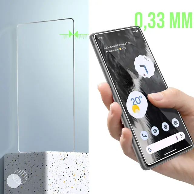 Zaščitno steklo iz kaljenega stekla za Google Pixel 7. S trdoto 9H se nikoli ne opraska in zagotavlja odlično zaščito zaslona. Visoka preglednost za videz HD zaslona. Zaradi majhne debeline 0,3 mm je steklo na zaslonu skoraj nevidno.