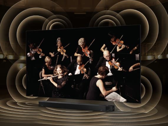 Obdajte se s harmoničnim zvokom televizorja in Soundbar zvočnika. Q-Symphony omogoča televizorju in Soundbar zvočnikom, da delujejo hkrati za boljši učinek obdajajočega zvoka, ne da bi za to morali utišati zvočnike na televizorju. * Q-Symphony je na voljo le skupaj z združljivim Soundbar zvočnikom.