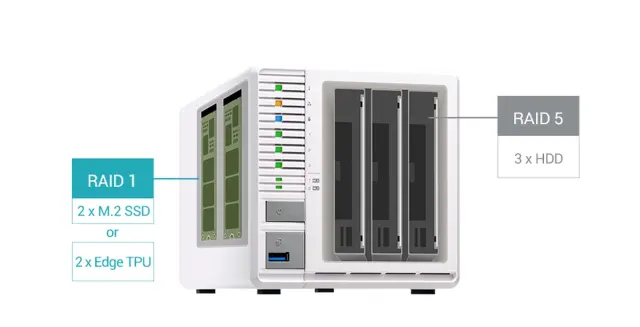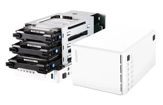 Visoko zmogljiv NAS za 3 diske z RAID 5, 2.5GbE mrežo in M.2 SSD predpomnjenjem za zagon virtualizacij in Qtier.