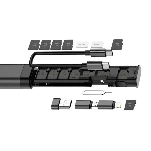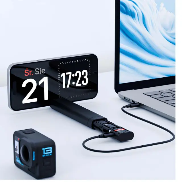 Vgrajen bralnik kartic TF s pomnilnikom za 6 kartic micro SD in 2 kartici nano SIM. Priložen je kabel USB-C z USB-C 65W za hitro polnjenje in hiter prenos. Trije praktični adapterji: USB-A, microUSB in Lightning. Vgrajeno držalo za telefon za prostoročno uporabo pri klicanju ali gledanju videoposnetkov.