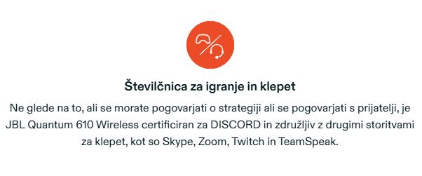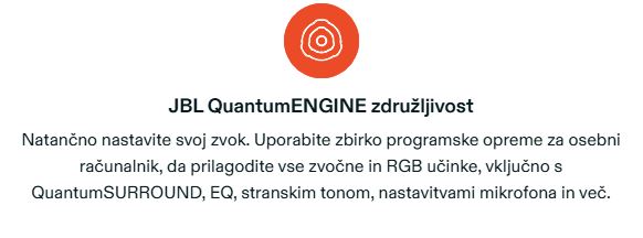 Vključite se v igro. Potopite se v epsko izkušnjo in uživajte v zvoku, ki prihaja iz vseh kotov, vse to pa omogoča tehnologija JBL QuantumSURROUND*. Opremljen je tudi z DTS headphone:X v2.0. *Na voljo samo za PC s povezavo USB prek JBL QuantumENGINE.