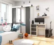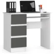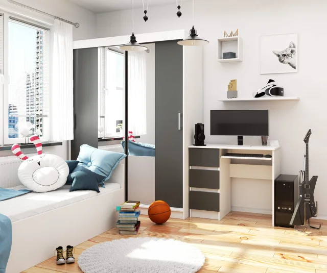 Pisalna miza A-6 v beli/grafitno sivi barvi bo odlično delovala v otroški in mladinski sobi, pa tudi v delovnem prostoru. Njene majhne dimenzije bodo omogočile tudi ureditev prostora za učenje ali delo na daljavo v spalnici ali dnevni sobi. Miza je prav tako odlična za organizacijo majhne, intimne pisarne. Zaradi kombinacije bele, gladke plošče z grafitno sivo vzorcem pohištvo dobro ustreza tako modernemu kot bolj klasičnemu pohištvu.