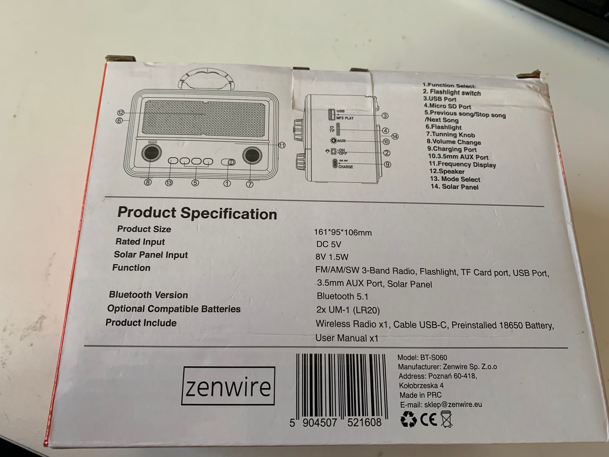 Radio Zenwire Vibe BT-S060 združuje retro slog s sodobnimi funkcijami. Ponuja FM/AM/SW radio in lahko deluje kot prenosni zvočnik Bluetooth , ki brezžično predvaja glasbo s telefona . Predvajanje iz USB, kartic micro SD in TF, AUX. Vgrajeno ima svetilko LED, ki zagotavlja dodatno osvetlitev na primer na kampiranju. Zahvaljujoč sončni plošči in zamenljivi bateriji, ki sta vključeni v komplet, se bo izkazal za uporabnega doma, v kuhinji, na gradbišču, v delavnici, na vrtu ali na poti, saj zagotavlja mobilnost, dostop do glasbe, radia in svetlobe ter neodvisnost od elektrike. Ergonomski vgrajeni ročaj omogoča enostavno prenašanje in služi kot priročno stojalo za telefon.
