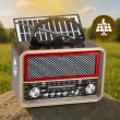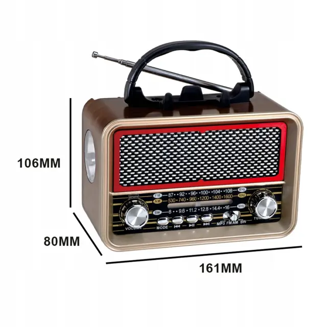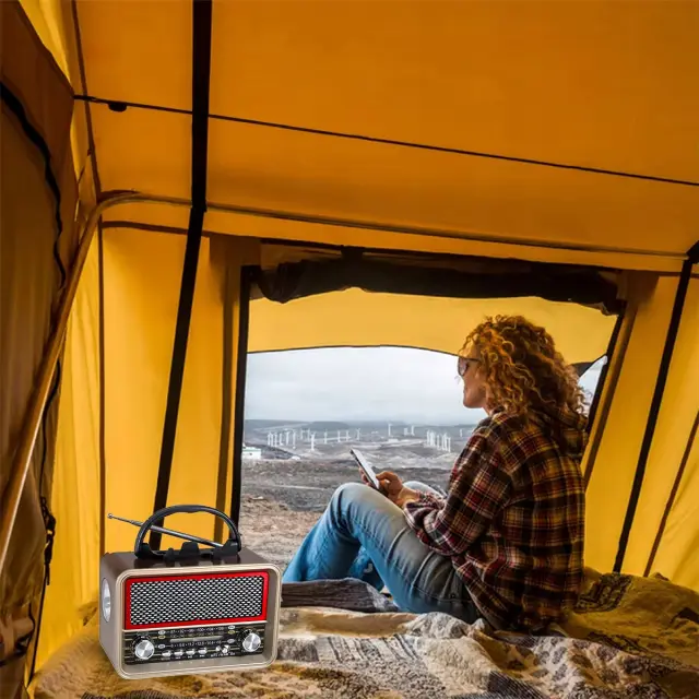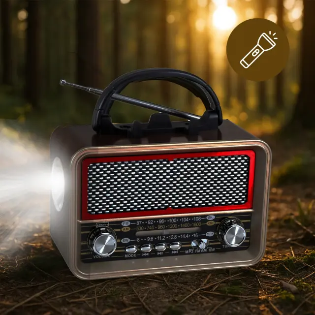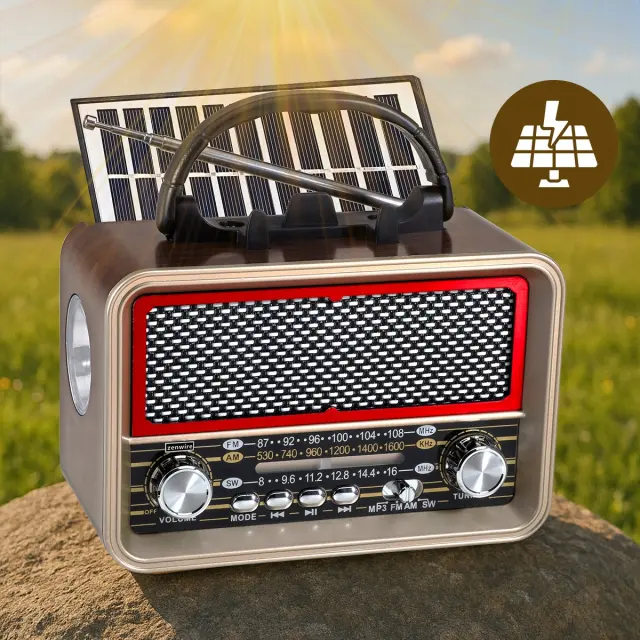 Radio je opremljen s solarno ploščo, ki omogoča polnjenje baterije s sončno energijo. To je praktična rešitev za potovanja, kampiranje ali na vrtu, ko nimate dostopa do elektrike. Ko radia ne uporabljate, ga lahko preprosto skrijete za radijski sprejemnik.