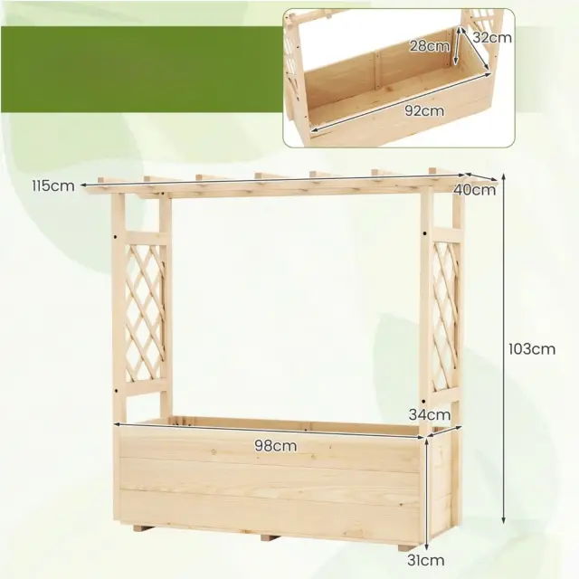 Naša dvignjena greda meri 115 x 40 x 103 cm (D x Š x V) in ima veliko škatlo za sadike z dvema stranskima rešetkama, ki zagotavljata dovolj prostora za gojenje različnih rastlin, kot so plezalke, rože, zelišča, zelenjava, sadje in druge. Ima tudi ravno streho z več prečkami, ki je kot nalašč za obešanje cvetličnih aranžmajev ali drugih okrasnih predmetov, kar različnim notranjim in zunanjim prostorom doda pridih elegance in sloga. Na osnovni plošči so tudi drenažne reže, ki pomagajo odvajati odvečno vodo in spodbujajo zračenje za boljšo rast rastlin. Naša vrtna postelja je izdelana iz visokokakovostnega borovega lesa, zato zagotavlja neprekosljivo vzdržljivost in naravno varnost ter je zanesljiva izbira za vaše potrebe vrtnarjenja na prostem. Lesene površine lahko tudi pobarvate ali obarvate v svoje najljubše barve ali vzorce, da ustrezajo vašemu slogu.