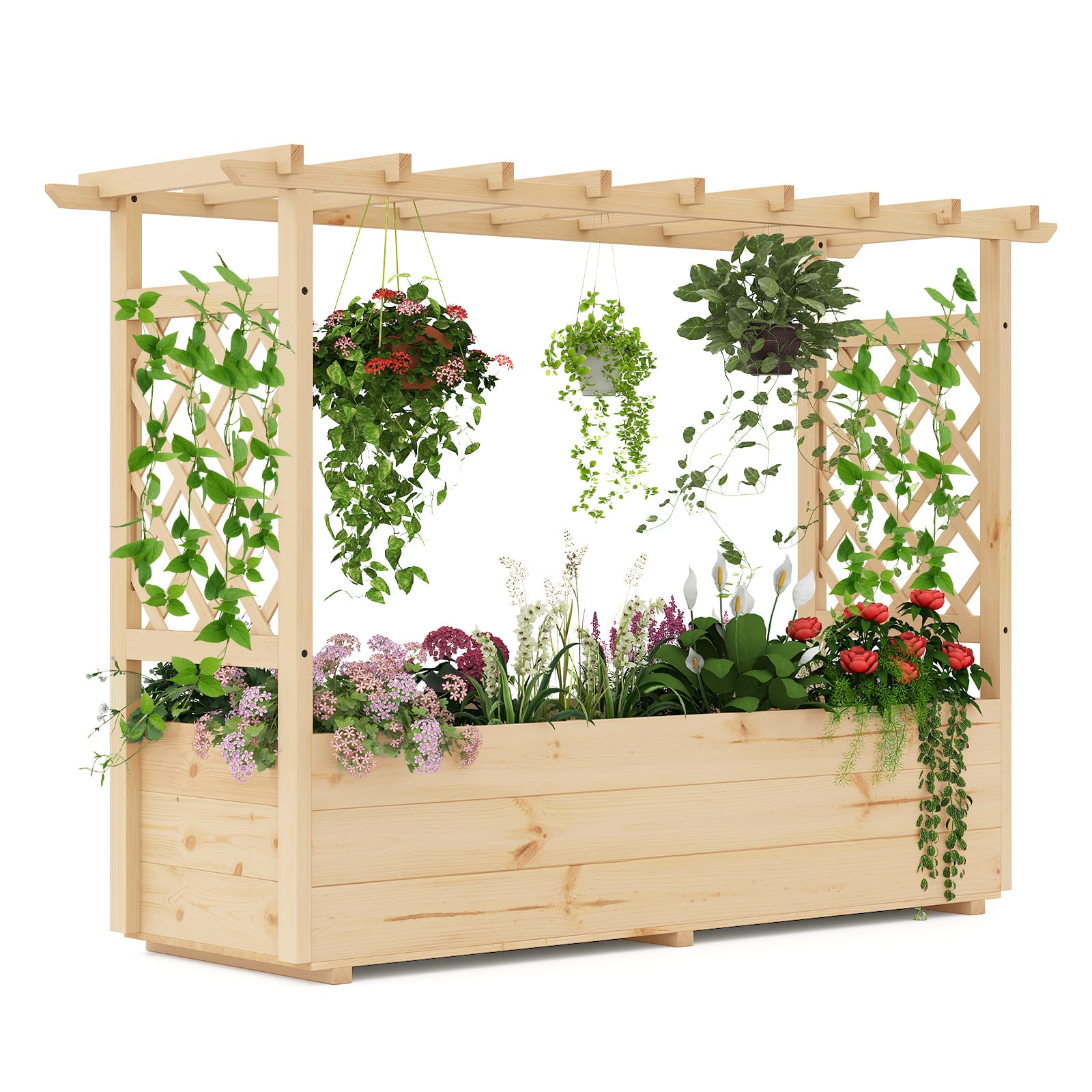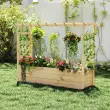 Naša dvignjena greda je opremljena z velikim zabojčkom za sadike z dvema stranskima rešetkama, ki zagotavljata dovolj prostora za gojenje različnih rastlin, kot so plezalke, rože, zelišča, zelenjava, sadje in druge. Ima tudi ravno streho z več prečkami, ki je kot nalašč za obešanje cvetličnih aranžmajev ali drugih okrasnih predmetov, s čimer boste različnim notranjim in zunanjim prostorom dodali pridih elegance in sloga.