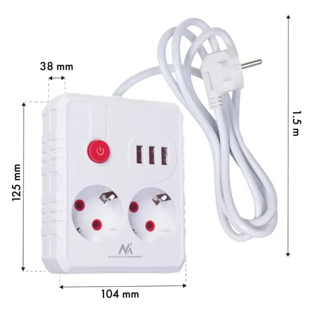 Razdelilec podaljšek MacLean MCE387W s 2 vtičnicami + 3xUSB, 1.5m, bel