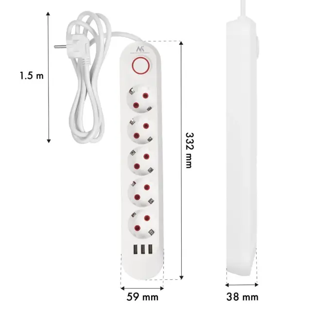Razdelilec podaljšek MacLean MCE395W s 5 vtičnicami + 3xUSB, 1.5m, bel