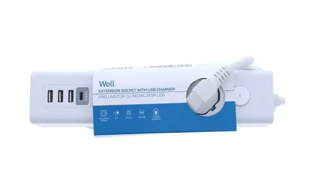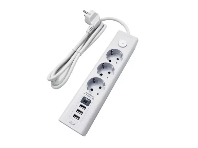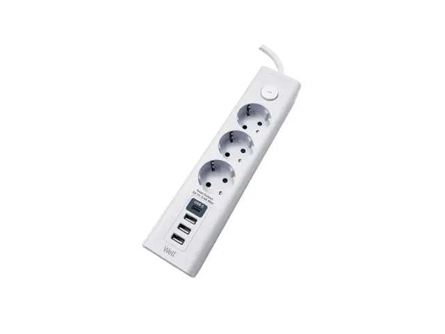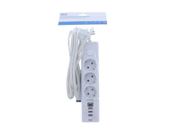 Razdelilec WELL 220V 1/3 3m + stikalo; 3xUSB-A + 1xUSB-C , bela barva, IP20, 16A