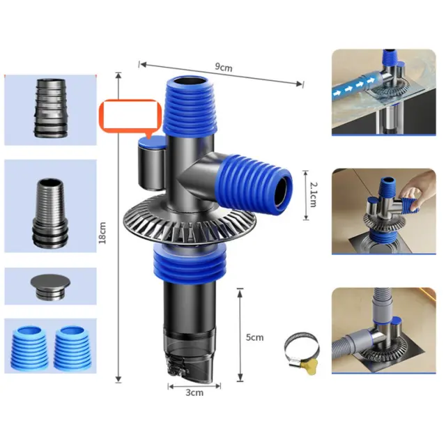 Razširjen talni odtok za pralni stroj – trosmerni priključek, zaščita proti vonjavam in prelivu Blue