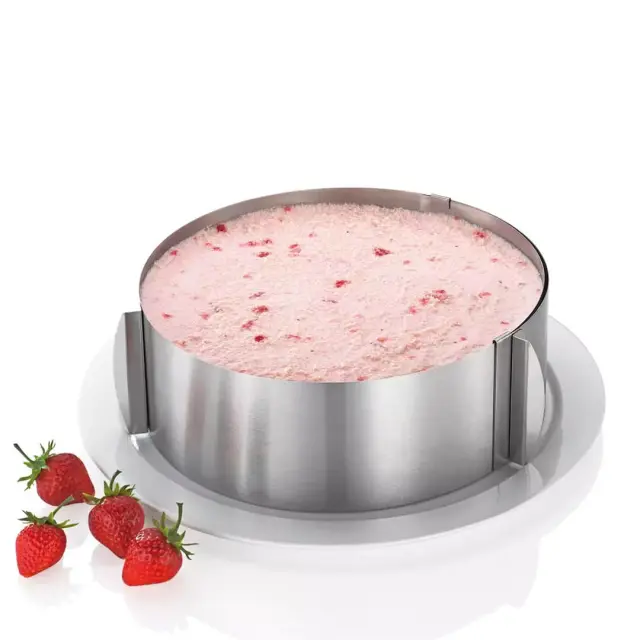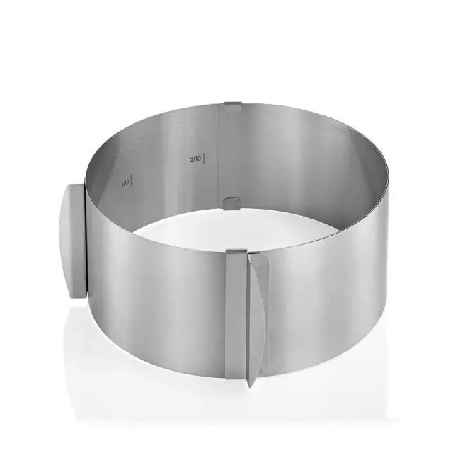 Prilagodljiv obroč za torto je zagotovo zmagovalec v vsaki »sladki« kuhinji. Premer torte je nastavljiv od 16 do 30 cm, višina pa je 8,5 cm. Obroč lahko prilagajate s pomočjo dveh ročajev in notranjo skalo. Izdelan je iz nerjavečega jekla in se lahko uporablja za peko različnih biskvitov, kolačev… Primeren je za pomivanje v pomivalnem stroju.
