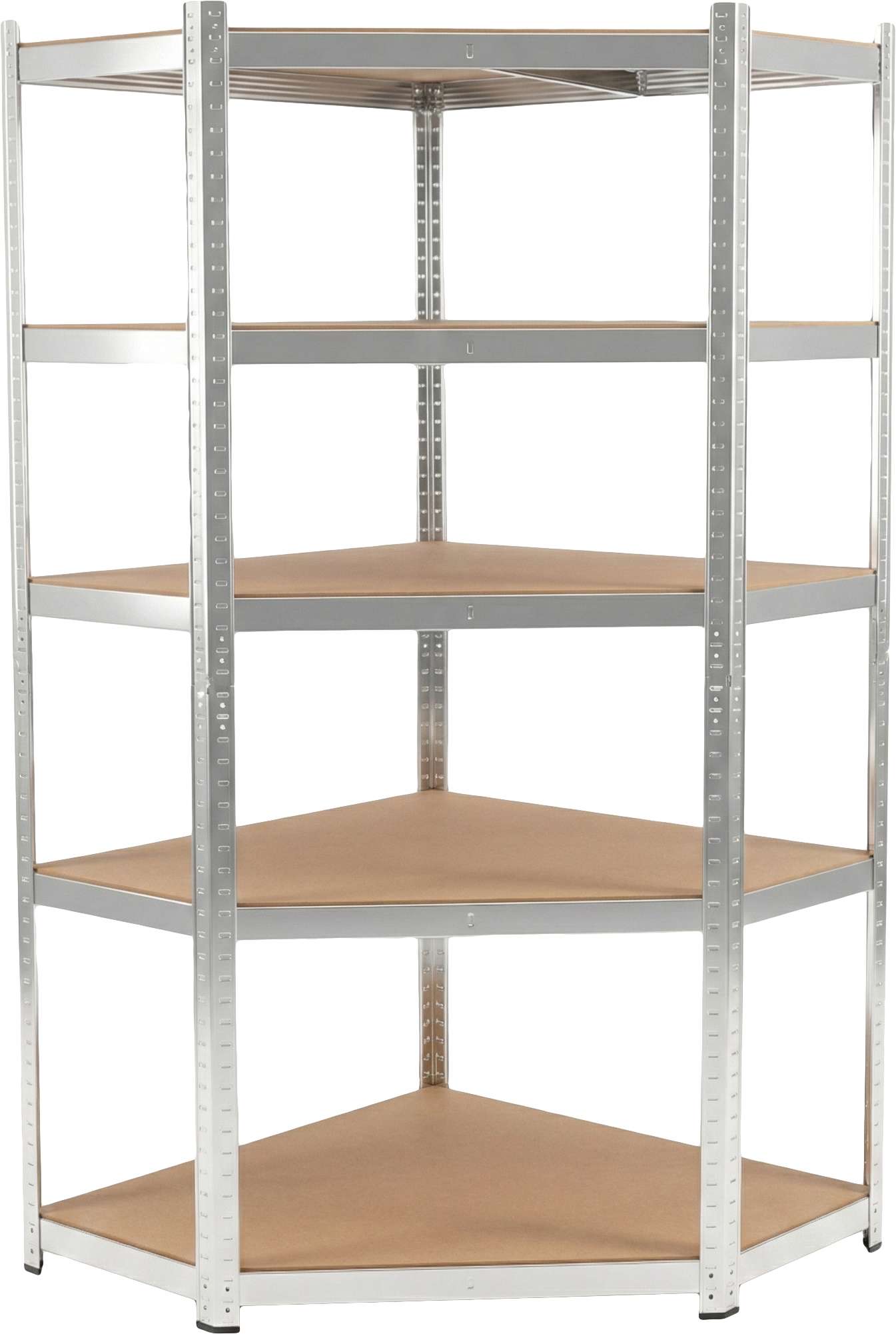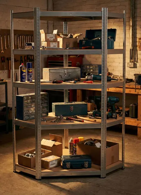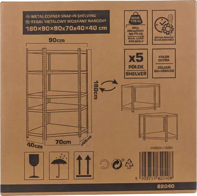 Izkoristite vsak centimeter svojega prostora! Kotna polica 62040 je idealna rešitev za prostore, kjer je optimalna izraba vogalov bistvenega pomena. Zahvaljujoč premišljeni zasnovi in visokokakovostnim materialom se polica odlično obnese kot samostojen kos pohištva ali kot ključni element v kompleksnih sistemih polic. KLJUČNE ZNAČILNOSTI Kotna zasnova: Maksimizira uporaben prostor v kotih prostorov.Visoka nosilnost: do 175 kg za vsako od 5 policMontaža brez vijakov: Sistem vstavljanja omogoča hitro montažo brez zapletenega orodja.Zaščita pred korozijo: Pocinkana površina zagotavlja vzdržljivost in odpornost proti vlagi v kleteh ali garažah. TEHNIČNE SPECIFIKACIJE: Višina: 180 cm Širina: 90 cm Globina: 40 cm Število polic: 5 polic iz masivnega MDF-ja Največja obremenitev police: 175 kg Največja skupna obremenitev: 875 kg Debelina profila: 0,6 mm Vrsta montaže: Brezvijačna / vtična Material okvirja: pocinkano jeklo (zaščiteno pred korozijo) Material police: MDF plošča visoke gostote Zaščitne nogice: Priložene (iz plastike, ščitijo tla pred praskami) ZAKAJ IZBRATI TA MODEL? STABILNOST IN VARNOST: Profil debeline 0,6 mm in ojačitve pod policami zagotavljajo, da je polica toga in se pod obremenitvijo ne maje. SISTEM NEPREKINJENEGA SHRANJEVANJA: Odlično se kombinira s klasičnimi kovinskimi policami, kar vam omogoča, da ustvarite estetsko privlačen in neprekinjen sistem shranjevanja vzdolž sten. ZAOBLJENI ROBOVI: Zmanjšajte tveganje poškodb med sestavljanjem in vsakodnevno uporabo. ZAŠČITNE NOŽICE: Priložene plastične nogice ščitijo tla pred praskami in stabilizirajo polico. ESTETSKO POCINKANJE: Srebrna, pocinkana površina daje regalu profesionalen, tehničen videz, ki se poda v vsak prostor. IDEALNO ZA: Garaža in delavnica (za težko orodje in dele) Klet in shramba (odpornost proti koroziji in vlagi) Skladišče in trgovina (optimizacija prostora) Arhiv (varno shranjevanje dokumentacije) V KOMPLETU PREJEMATE: Kompletna kotna polica 62040 za samostojno montažo 5 masivnih MDF polic Zaščitne noge Navodila za sestavljanje