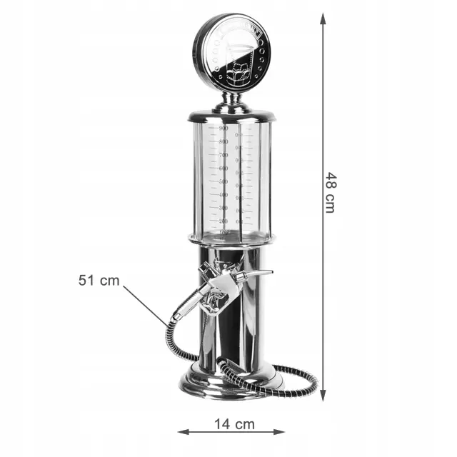 Originalni točilnik za pijačo, pivo in druge žgane pijače. Nenavadna oblika bencinskega avtomata. Priročna črpalka v obliki pištole za točenje goriva. Popoln pripomoček, ki bo služil kot nalivalec za zabave ali izvirno rojstnodnevno darilo. Velik, prozoren rezervoar za pijačo s tehtnico. Kromirano ohišje poveča estetsko izkušnjo.