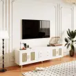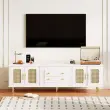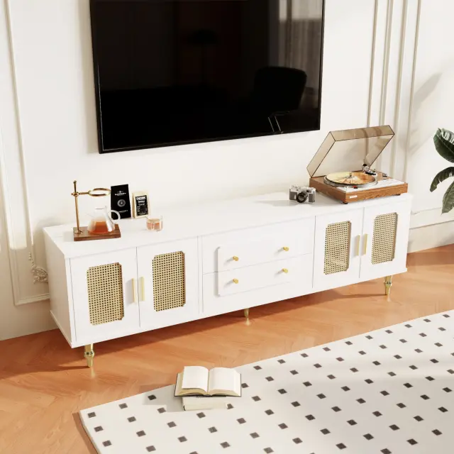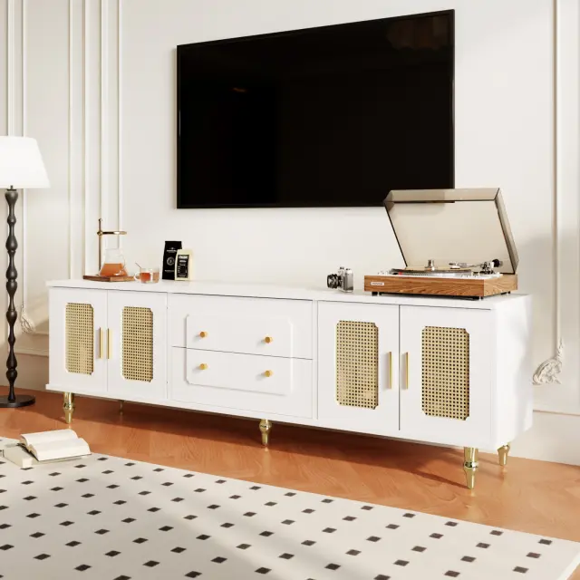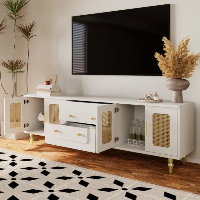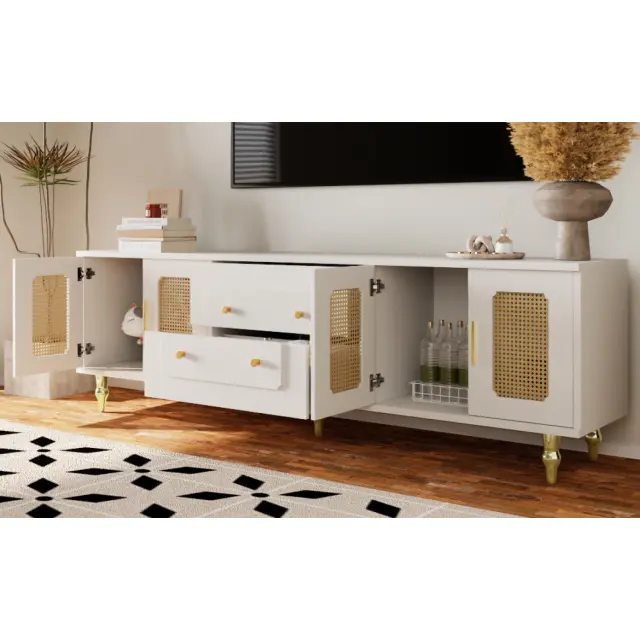 Retro TV stojalo z zlatimi ročaji, ratanovimi vrati in kovinskimi nogami. Veliko prostora za shranjevanje.