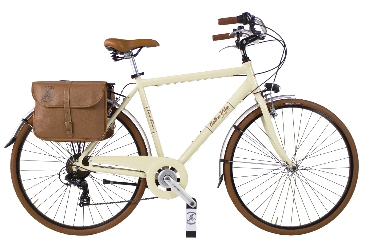 Aluminijast okvir 28" kolesa (700 x 35) Menjalnik TX50, 6 prestav Ročaji za prestavljanje grip-shift, 6 prestav Aluminijaste V-Brake zavore Aluminijasto krmilo z nastavljivim nosilcem Aluminijasti gonilni sklop s kasetno osjo Sprednja in zadnja LED luč na baterije Blatniki iz pobarvane smole v barvi usnja/sivi Zadnji prtljažnik homologiran za otroški sedež Torbe iz umetnega usnja v barvi usnja (vključene)