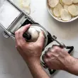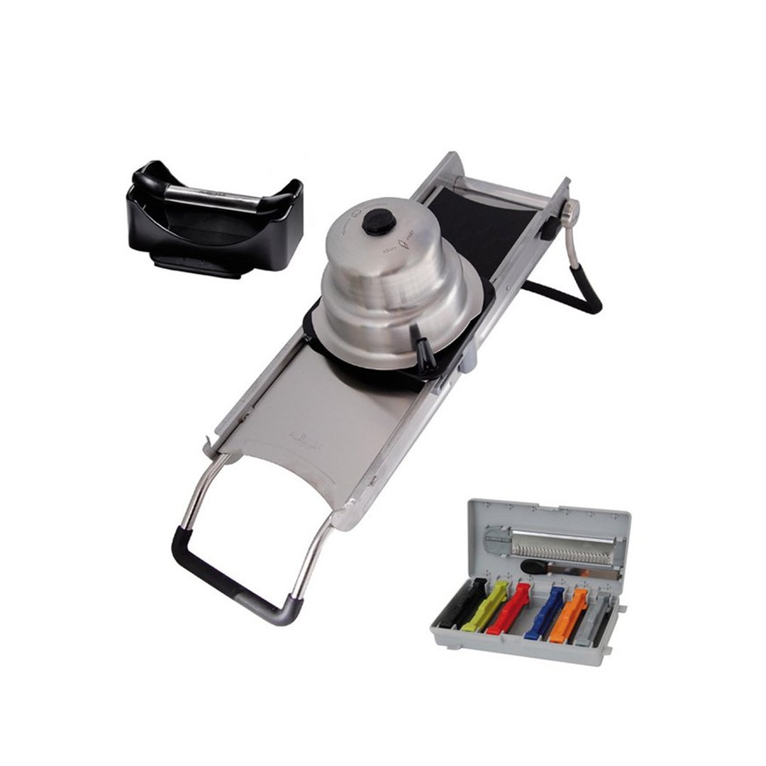 DE BUYER rezalnik mandolina z izjemno ostrim in kakovostnim rezilom iz nerjavečega jekla omogoča enostavno prilagajanje debeline reza. Ogrodje je trdno in stabilno, noge stojala so dodatno prevlečena z nedrsljivo prevleko. Varno drsenje po rezilu omogoča drsnik oz. potiskač, ki je ravno tako iz nerjavečega jekla. Z rezalnikom lahko dosežete gladke in valovite okrogle rezine, vafelj rezine in trakce julienne s širino 2-3-4-5-7 in 10 mm. Obojestransko rezilo omogoča natančno rezanje tudi najmehkejše zelenjave in sadja s tanko lupino kot so pomaranče, kivi, paradižnik … Za nego rezil priporočamo ročno pranje, medtem ko je ogrodje rezalnika primerno tudi za pomivanje v pomivalnem stroju.