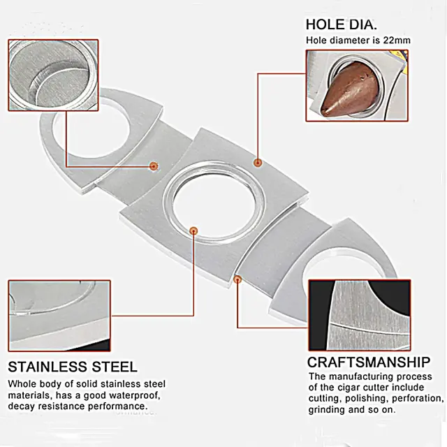 Dobro polirano nerjaveče jeklo: pobiralnik cigar v klasičnem, elegantnem dizajnu z ostrimi dvojnimi rezili. Za enostavno rezanje majhnih in velikih cigar. Luknja ima premer 22 mm.