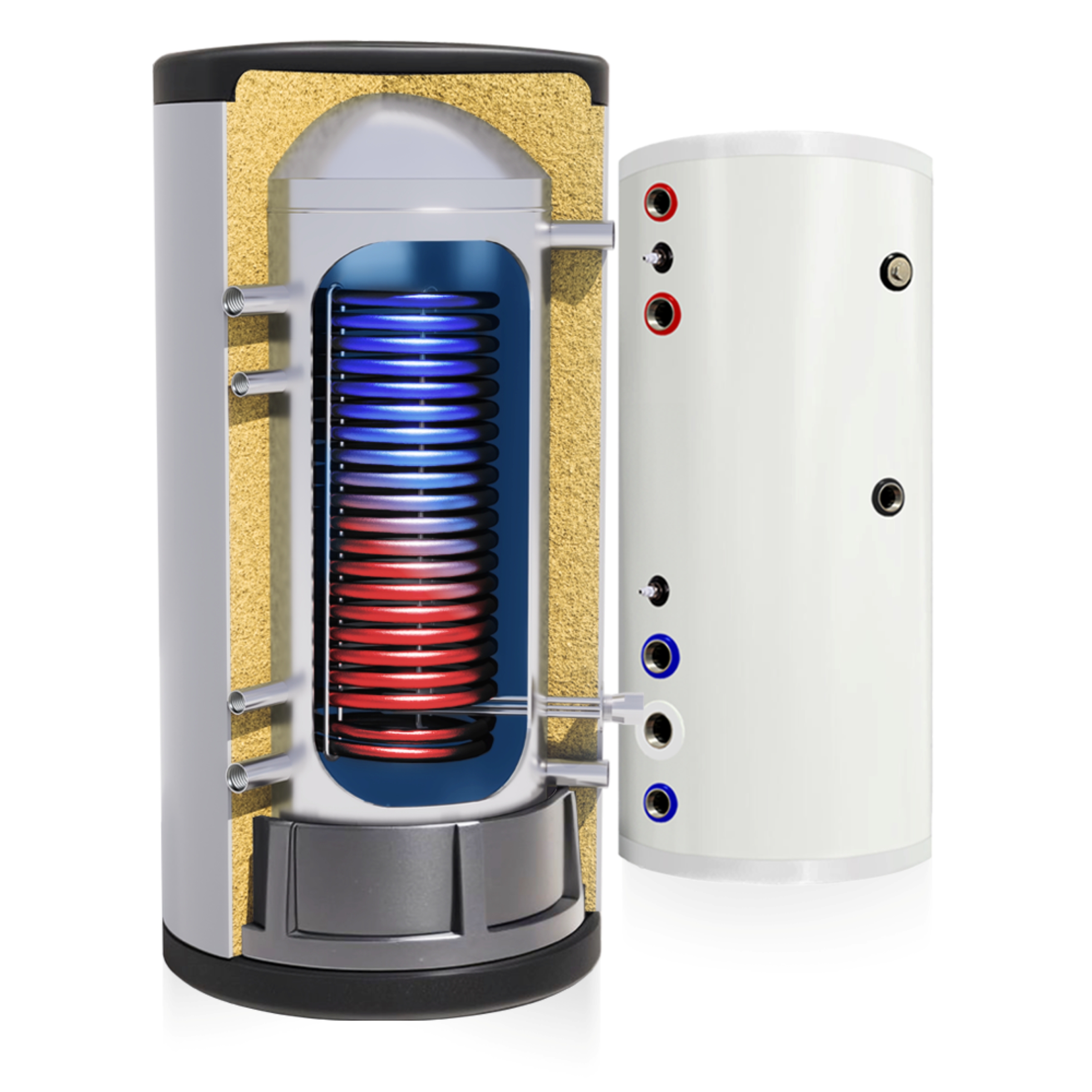 4 m² tuljava omogoča hitro segrevanje vode – približno 19 minut v območju od 10 do 45 °C – in nižje stroške ogrevanja. Vertikalna, kompaktna zasnova olajša namestitev tudi v majhnih kotlovnicah. Rezervoar iz nerjavečega jekla SUS304 je zelo odporen proti koroziji, temperaturi in delovnemu tlaku. Gladka INOX-spiralna cev zagotavlja nizek hidravlični upor, zmanjšuje nastajanje vodnega kamna in zagotavlja stabilno delovanje sistema. 50 mm debela izolacija iz poliuretanske pene učinkovito zmanjšuje toplotne izgube, ki pri ΔT 50 K znašajo 1,53 W. Postopki dekapiranja in pasiviranja dodatno ščitijo rezervoar na varjenih mestih. Rezervoar je združljiv s toplotnimi črpalkami, plinskimi kotli, kotli na trdno gorivo, sončnimi napravami in kamini z vodnim plaščem. Vgraditi je mogoče 6/4" električni grelnik.