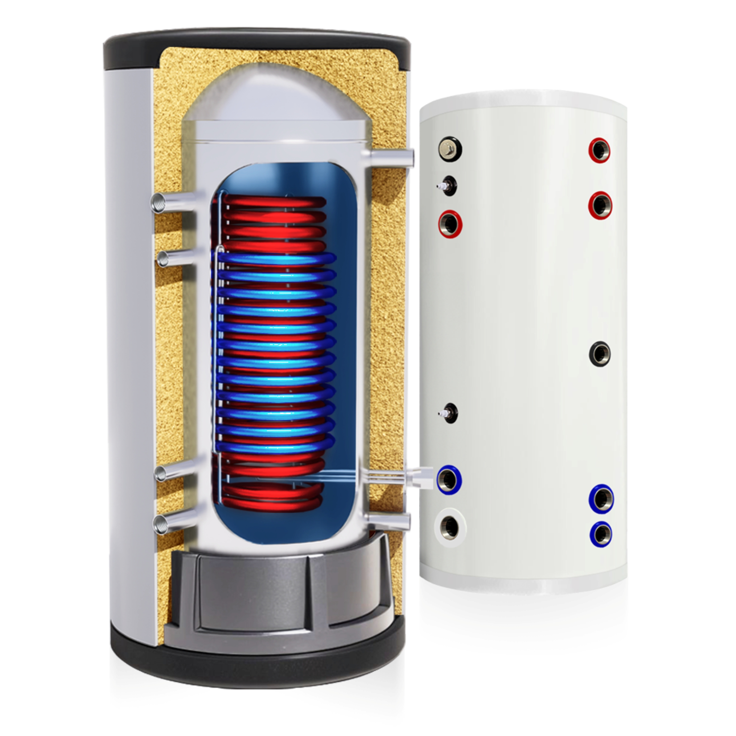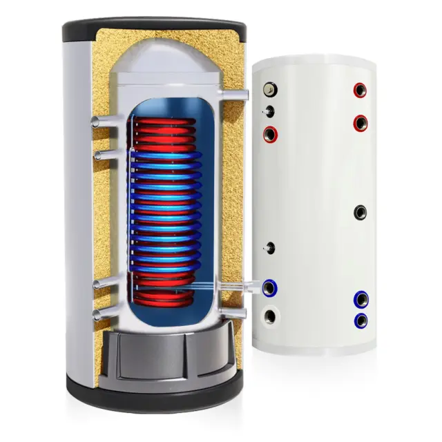Ključne prednosti Dve tuljavi omogočata zelo hitro segrevanje vode – približno 21 minut v območju od 10 do 45 °C – in učinkovito delovanje z različnimi viri toplote. Nerjaveče jeklo SUS304 zagotavlja visoko odpornost proti koroziji, temperaturi in delovnemu tlaku ter popolno higieno gospodinjske vode. Gladke INOX cevi tuljave zagotavljajo nizek hidravlični upor in zmanjšujejo nastajanje vodnega kamna. 50 mm debela izolacija iz poliuretanske pene učinkovito zmanjšuje toplotne izgube, ki znašajo 1,94 W pri ΔT 50 K. Postopki jedkanja in pasiviranja dodatno ščitijo rezervoar na varjenih mestih in zagotavljajo dolgo življenjsko dobo. Rezervoar je združljiv s toplotnimi črpalkami, plinskimi, oljnimi in trdnimi gorilniki, sončnimi napravami in kamini z vodnim plaščem. Vgraditi je mogoče 6/4" električni grelnik.