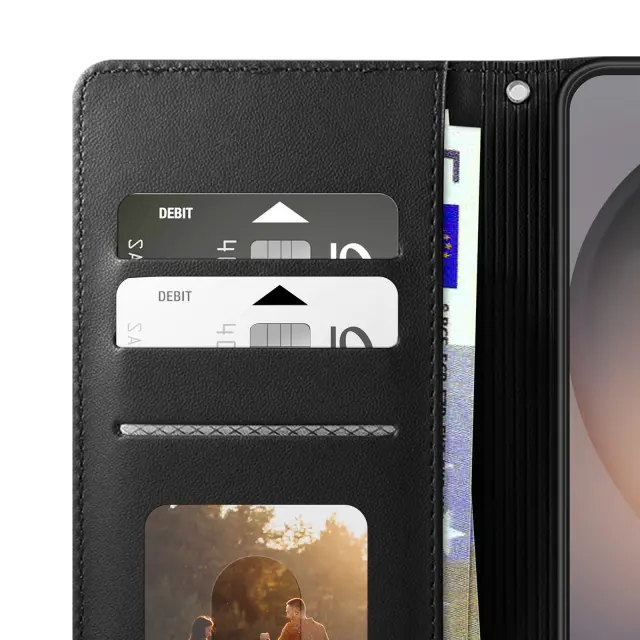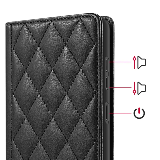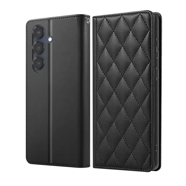 RFID denarnica za Samsung Galaxy S26 s podporo za shranjevanje kartic in videoposnetkov. Vgrajeno blokiranje RFID za omejevanje brezstičnega branja bančnih kartic. Vzdržljiv eko usnje s teksturo diamantnega vzorca, gelska silikonska lupina, odporna na udarce, in stabilen oprijem. Magnetno zapiranje, da je etui varno zaprt vsak dan, brez dodatne debeline.