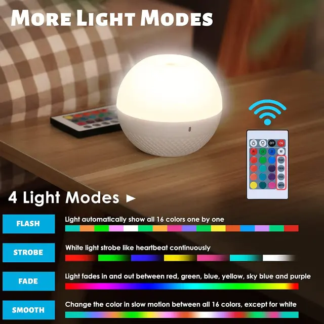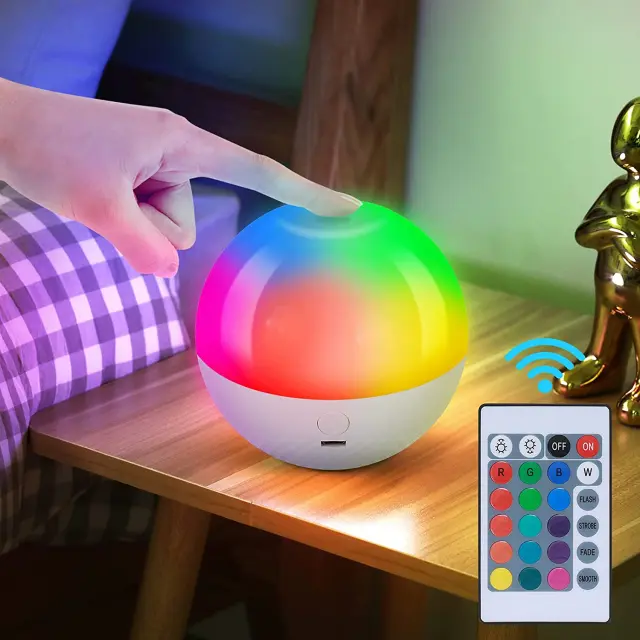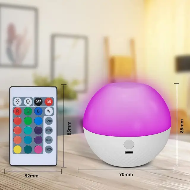 Prijetna polnilna večbarvna RGB LED nočna svetilka, primerna za postavitev na nočne omarice ali pisalne mize za ustvarjanje fantastičnih barvnih svetlobnih učinkov ali za kromoterapijo v otroških sobah, spalnicah in na vseh tistih mestih, kjer želite prostoru dati pridih barve. 39;okolje . Svetilka je iz termoplasta z otipnim senzorjem za spreminjanje barve. Lahko Lahko se uporablja kot lučka za dojenje ali lučka za razpoloženje. Opremljen je z polnilno baterijo prek kabla USB, ko jo napolnite, jo lahko uporabljate več ur. postaviti kamor koli. Ima LED, ki sveti, kar označuje polnjenje, priložen je daljinski upravljalnik za upravljanje vseh funkcij. Barvo lahko preprosto spremenimo s preprostim dotikom vrha te nočne lučke. S pridihom več; dolgo lahko prižigaš in ugašaš luč. Svetilka ima 16 nastavljivih barv in 4 načine. svetlobnih učinkov (enobarvni, Flash, Strobe, Fade). Spodbuja spanec in odganja strah pred temo. Lahko lahko uporabite tudi kot otroško nočno lučko, lučko za dojenje, svetilko za idealno vzdušje za boljši spanec. Tehnične lastnosti: Vhodna napetost: DC 5V Kapacitivnost; Kapaciteta baterije: 1200 mAh Velikost svetilke: Ø 95 mm x 89 mm Čas polnjenja: 3-4 ure Najdaljši čas uporabe: (po polni polnitvi) 80 ur (pri minimalni svetlosti)