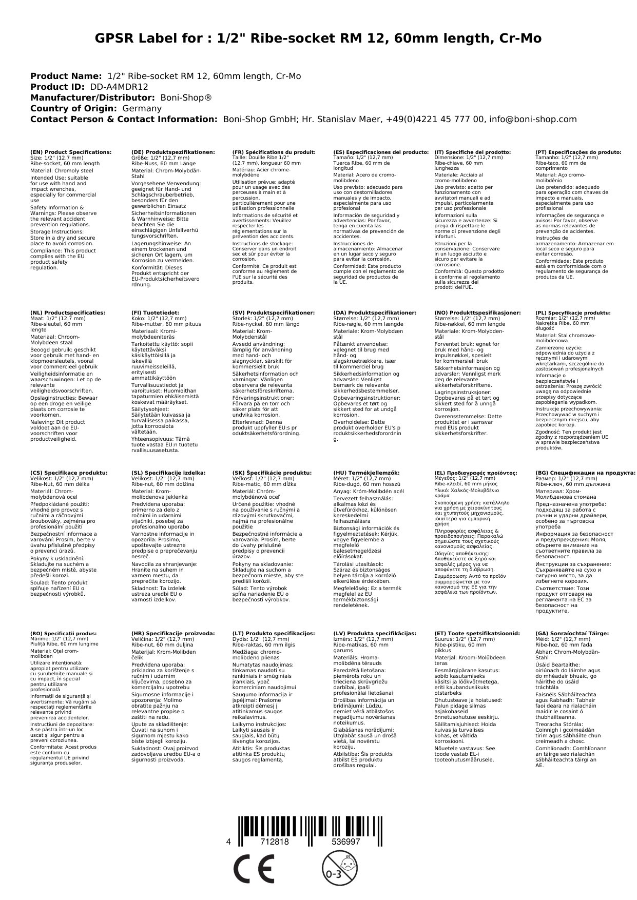 Ta visokokakovosten Ribe nastavek 1/2 col RM12 je zasnovan za tiste, ki cenijo natančnost in robustnost. Izdelan iz kakovostnega krom-molibden jekla (Cr-Mo), ponuja vrhunsko odpornost na obremenitve in dolgo življenjsko dobo tudi v zahtevnih pogojih. S svojimi 60 mm dolžine omogoča enostaven dostop do globlje ležečih vijakov, kar je še posebej uporabno pri uporabi z udarnimi vijačniki.