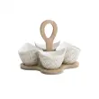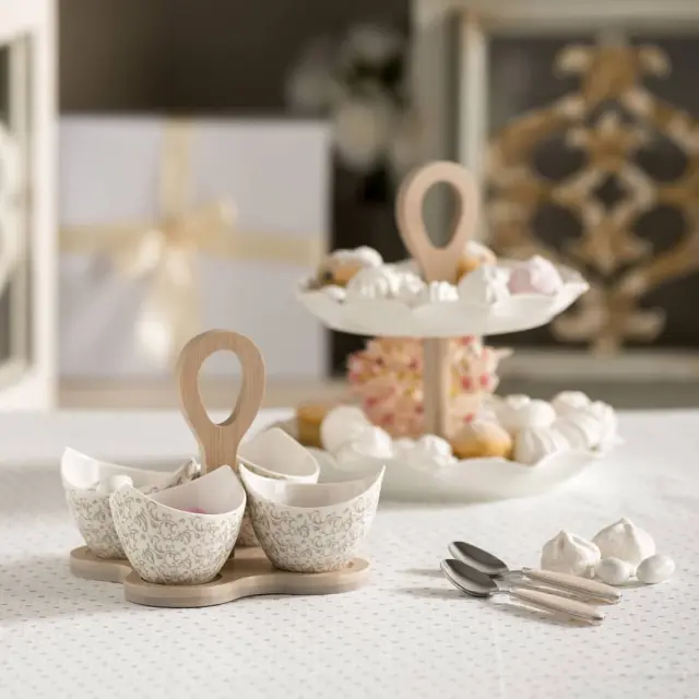 Brandanijev servirni set sestavljajo štiri skledice iz porcelana, ki so postavljene na podstavku iz bambusovega lesa - lični dodatek na vaši postreženi mizi ali pa preprosto odlična ideja za darilo. Dopolnite vašo zbirko še z ostalimi Brandani izdelki iz kolekcije "Riccioli di fata", za katere sta značilna eleganten bel porcelan in nežen cvetlični vzorec v zlatih tonih. Skledice (brez bambusovega podstavka) lahko perete v pomivalnem stroju.