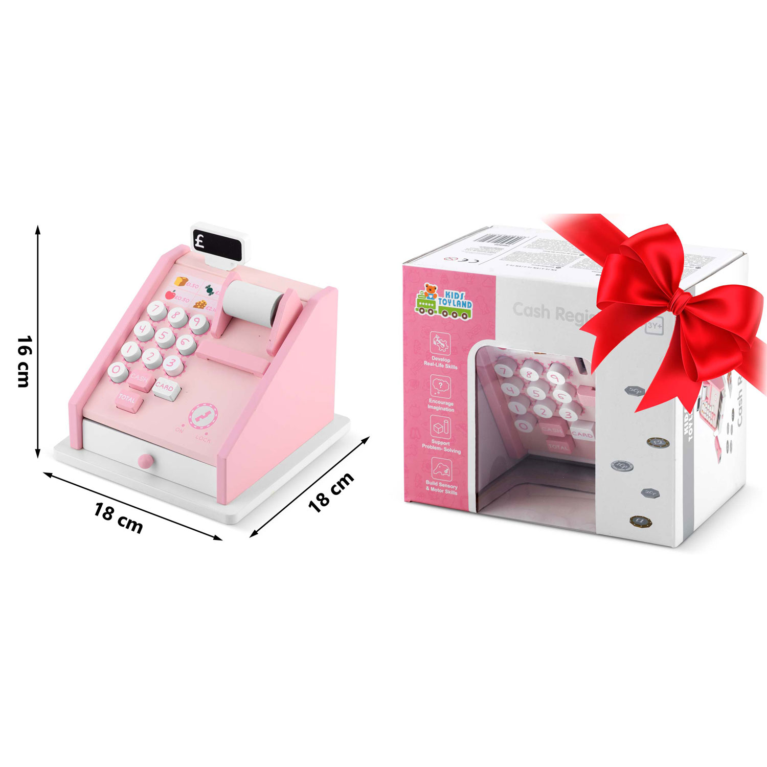 Introduce your child to commerce with the Ricokids Wooden Toy Cash Register RK-868. This vibrant cash register features an opening drawer for banknotes and coins. Kids will love writing bills on receipt paper, scanning items, and processing payments with the card terminal. Made from high-quality natural wood, it's safe for young users and stimulates visual perception with bright colors. Perfect for imaginative play, it develops counting and social skills. The set includes a cash register, scanner, card terminal, 10 banknotes, and 5 coins, making it a great gift for any occasion.