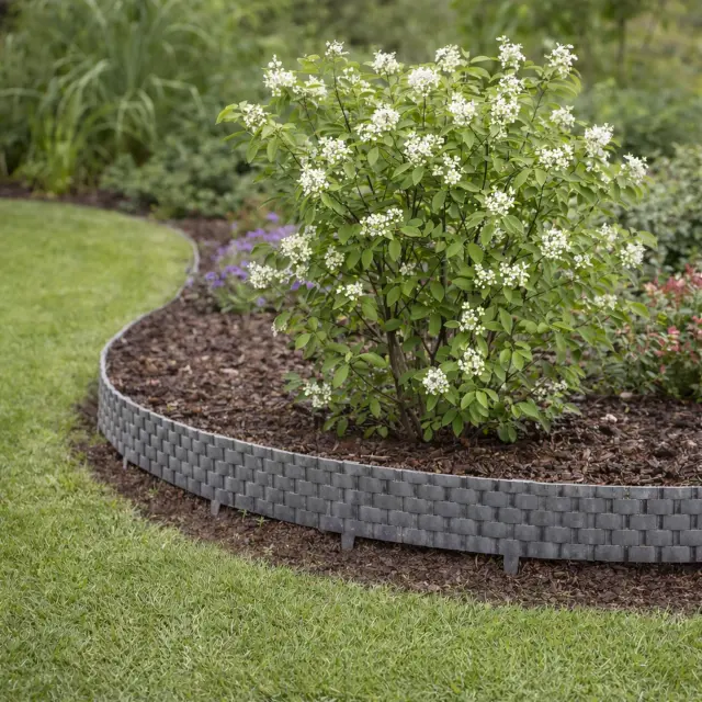 Zahvaljujoč elastičnemu materialu so možne ravne, okrogle ali valovite linije. Module enostavno povežete med seboj in jih z gumijastim kladivom pritrdite v tla – brez posebnega orodja. Za daljše robove lahko brez težav dodate dodatne sete. V sivi barvi se dizajn odlično poda k sodobnim vrtovom in ustvari eleganten okvir z ratan strukturo.